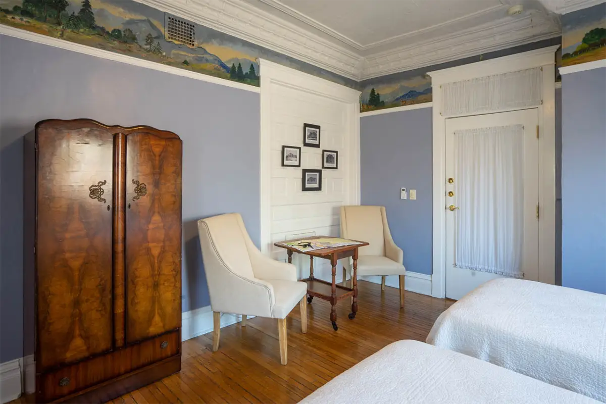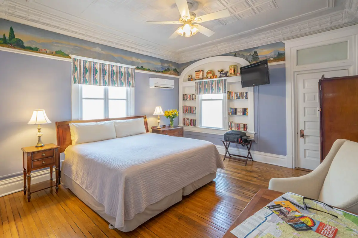 Historic charm fills the space, from the original pressed tin ceiling to the hardwood floor beneath your feet. Encircling the room, a hand-painted mural of New Mexico’s mountains—crafted by a Bottger family member in the 1930s—brings a touch of local artistry and heritage to your stay. This room honors Edward Buxton Cristy, the innovative architect of the Bottger Mansion and the creative mind behind the Pueblo Revival style so beloved in New Mexico.