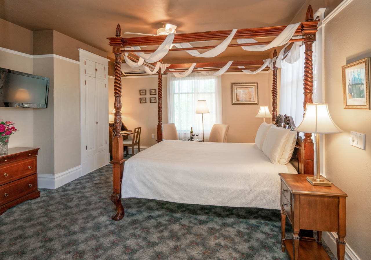 The Franz Huning Room welcomes you with elegance, comfort, and a view of the mountains on the second floor of our historic inn. Sleep soundly in a queen bed with an intricately carved headboard, and savor the luxury of your private bathroom, where a deep clawfoot tub and brass chandelier invite you to soak, relax, and recharge.